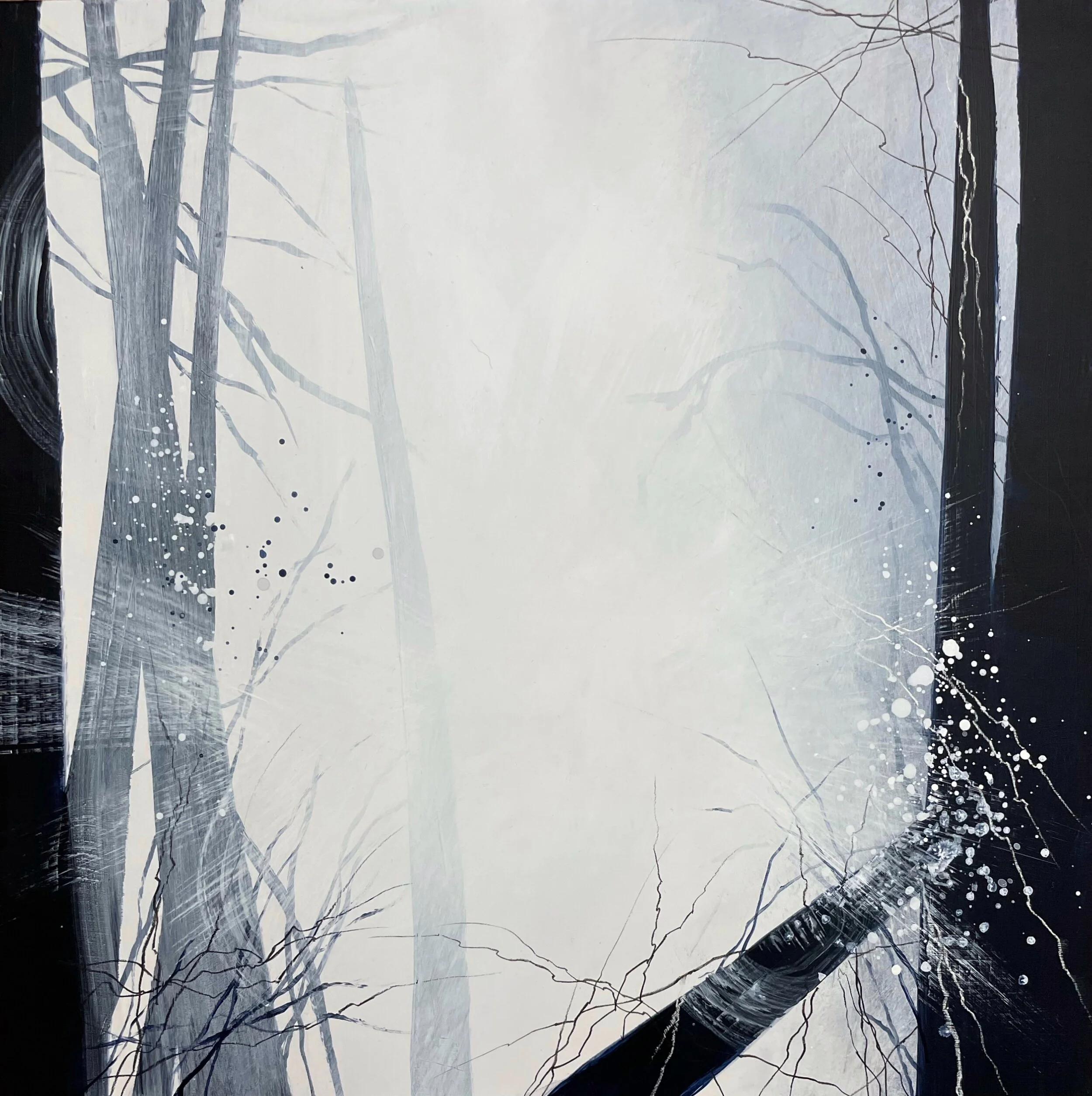 These large pieces are 30” x 30” cradled wood panels with a 2” deep cradle. As I created the work, the intention was to make these pieces feel like large doorways into the spaces.