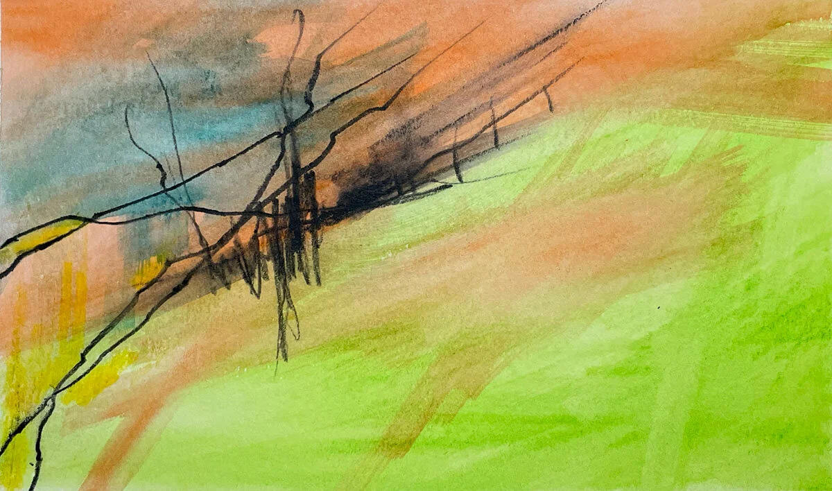A certain kind of mark always shows up in my art, and “Seeking” is one of the first times that mark became a main character instead of a supporting one. This series was a set I did on small but high quality paper in which I wanted to explore texture and composition with a brighter color palette, and I specifically wanted to explore the texture I was getting with ink pencils. Using water to obliterate the marks but retain some of the texture was the appeal here.